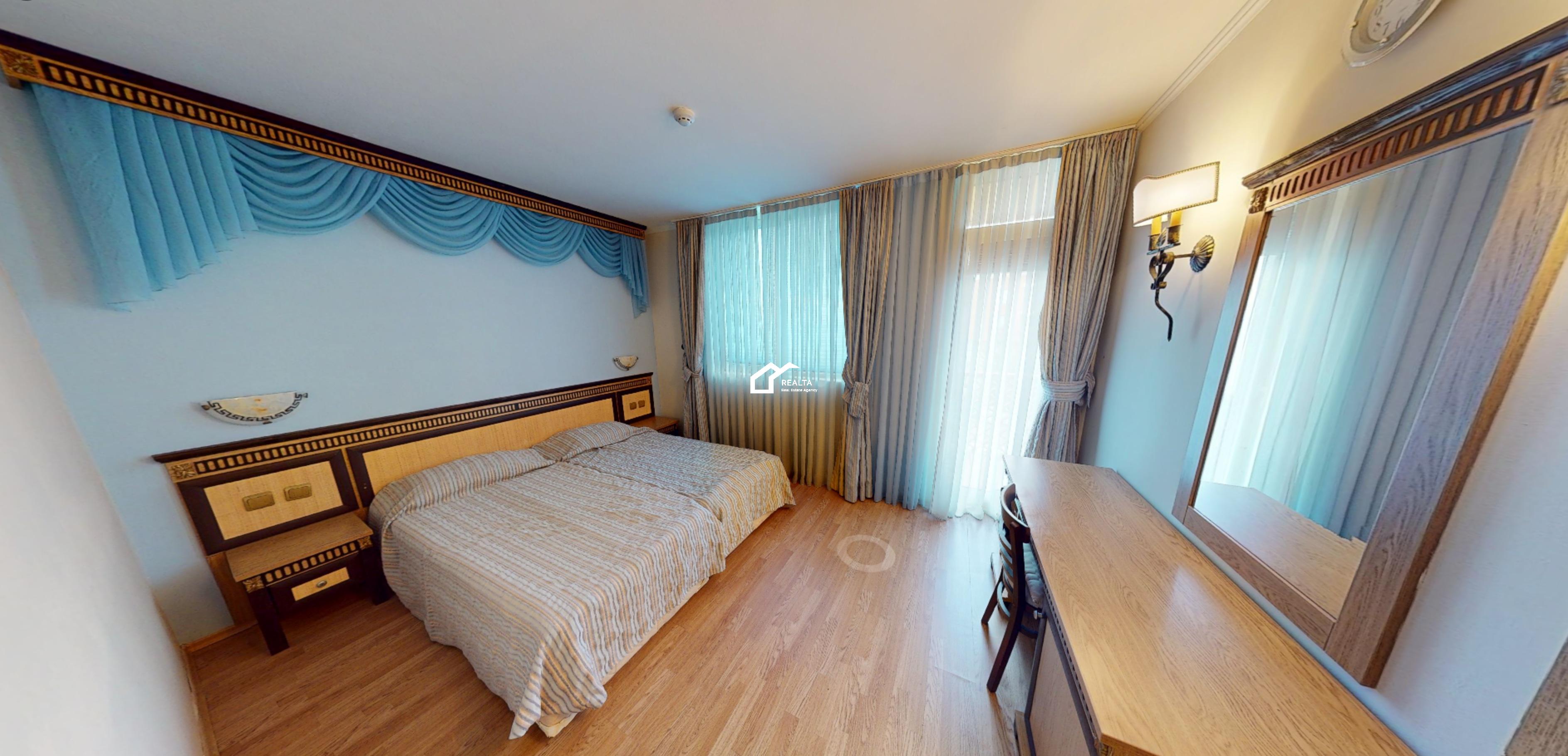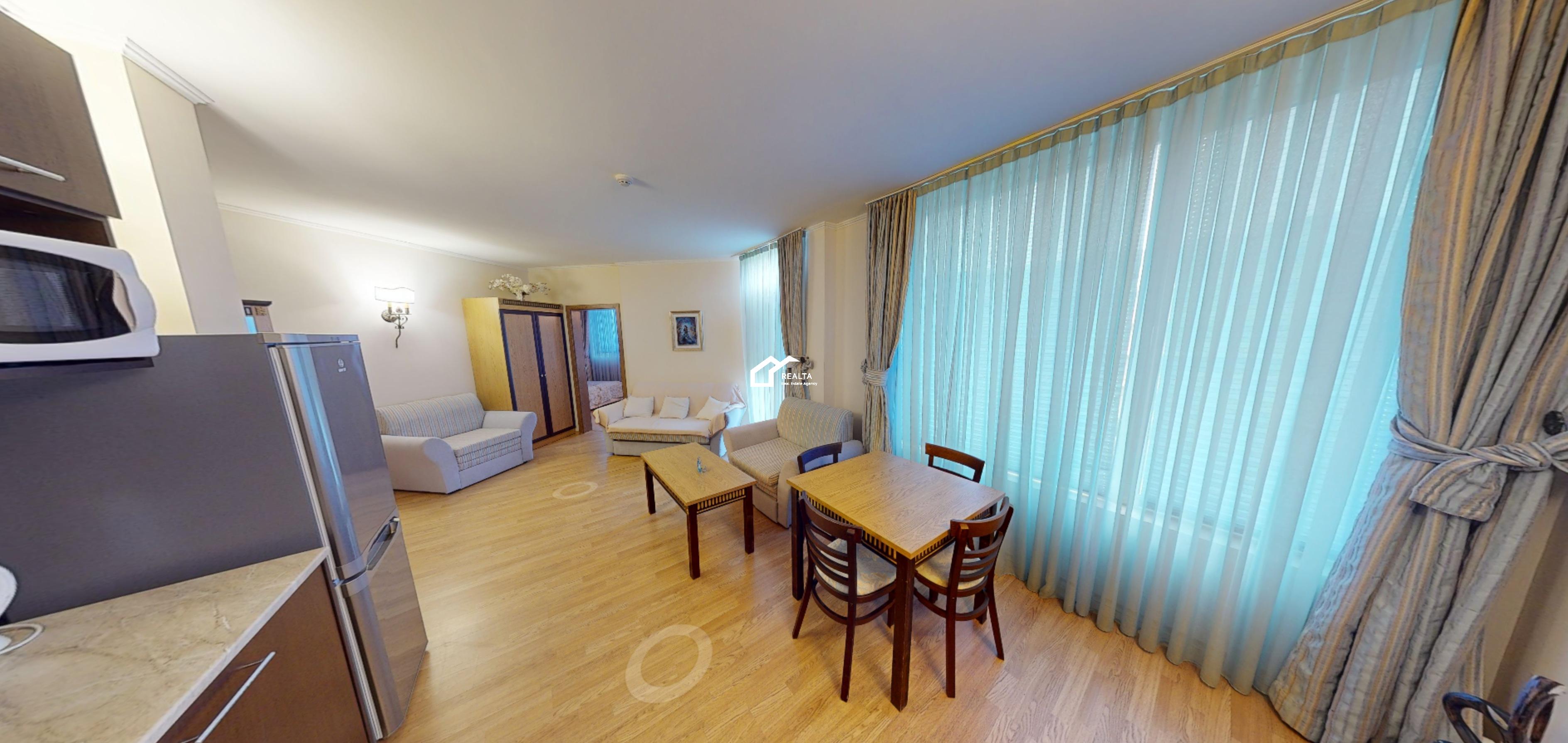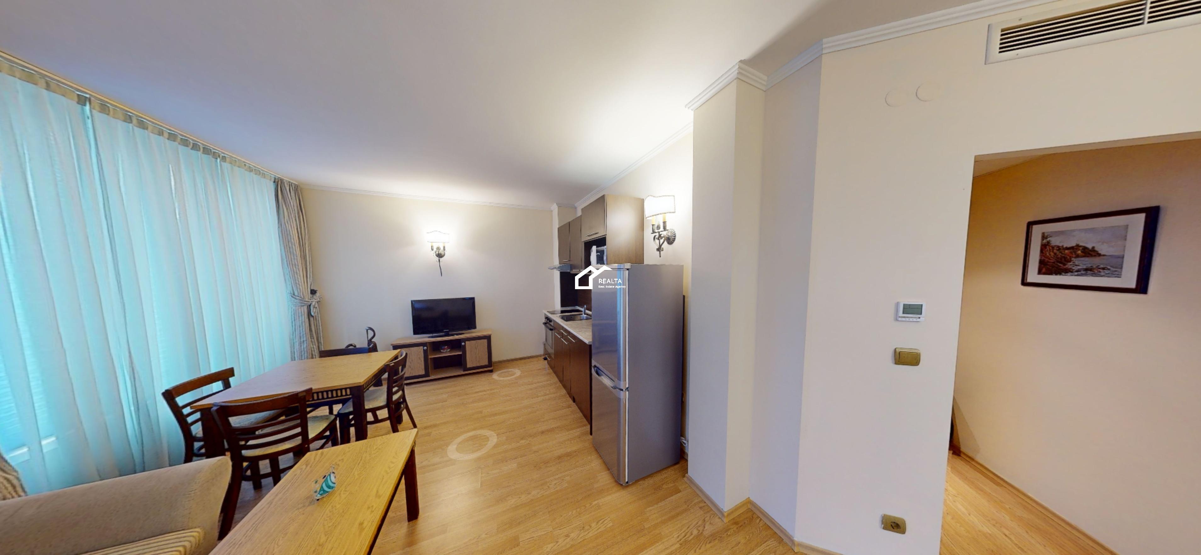 Просторный 2-спальный апартамент с террасой в апарт-отеле «Одиссей», Несебр. Вид на бассейн и горы. 350 м до моря. Полная меблировка, паркинг, SPA, бассейн. Идеален для проживания и инвестиций.